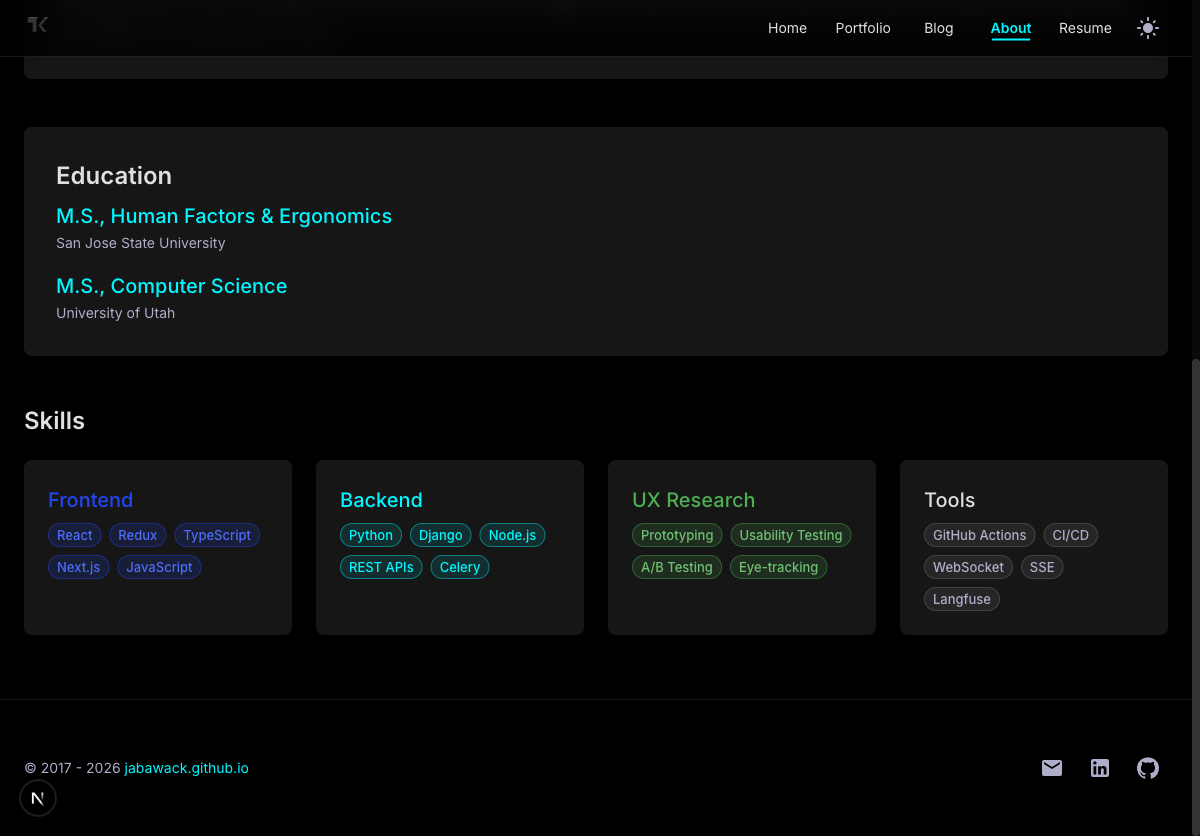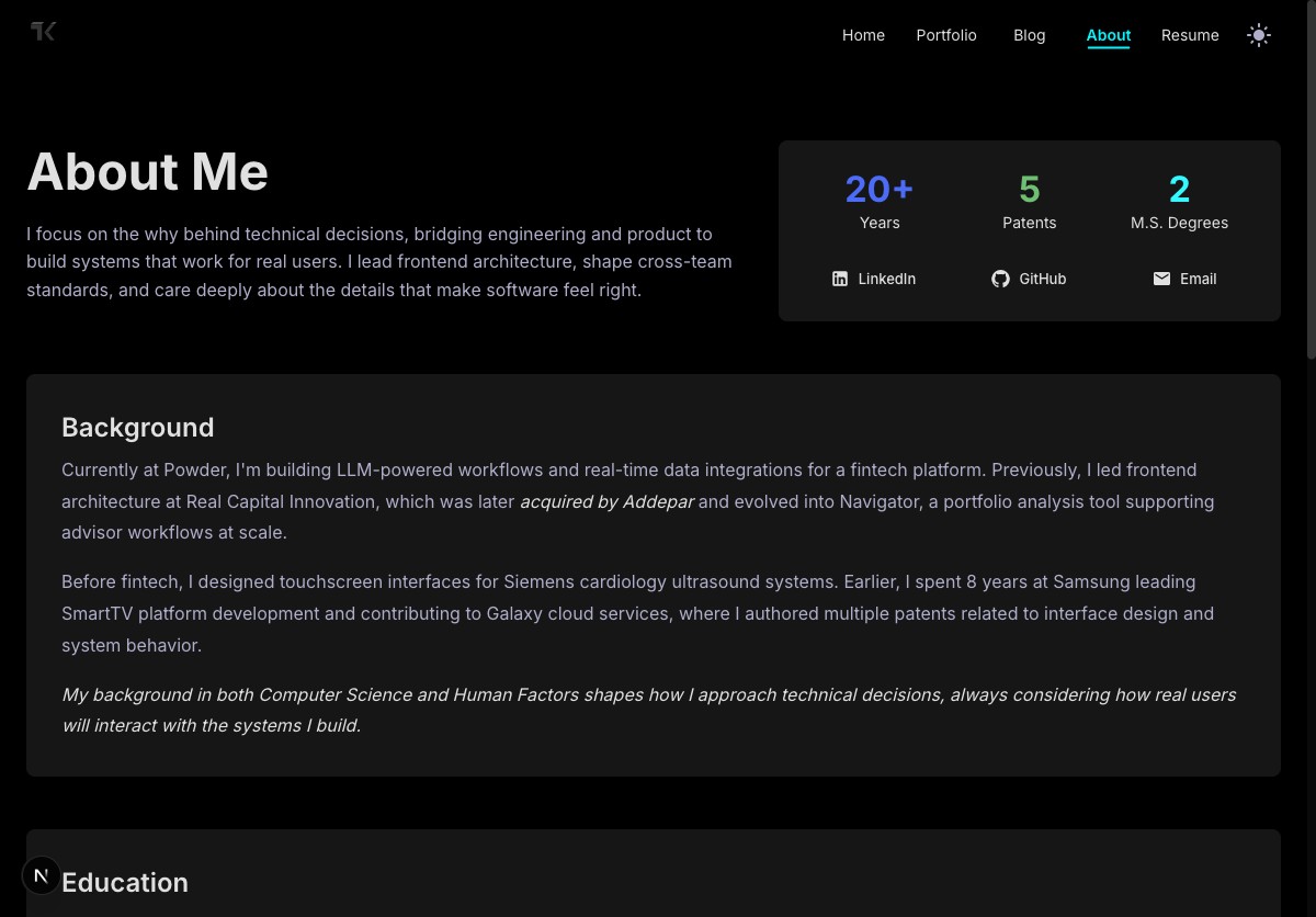 I've had a ProfileCard on my About page for a while now. It shows three stats: 20+ years of experience, 5 patents, and 2 master's degrees. Clean, compact, gets the point across. The education section below backs up the degrees. The background section covers the experience.
