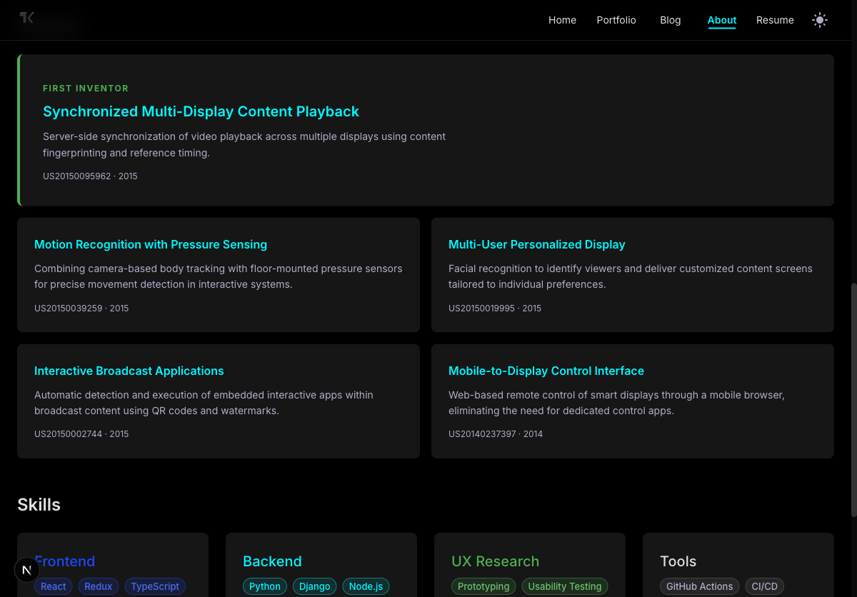 This was one of those changes that took maybe thirty minutes to build but addresses something that's been quietly wrong for a long time. The About page now actually tells the full story that the ProfileCard promises. "5 Patents" isn't just a stat anymore. It's a section with titles, descriptions, and links.