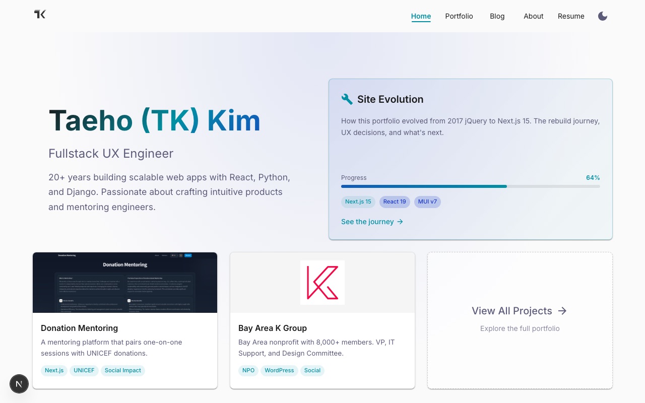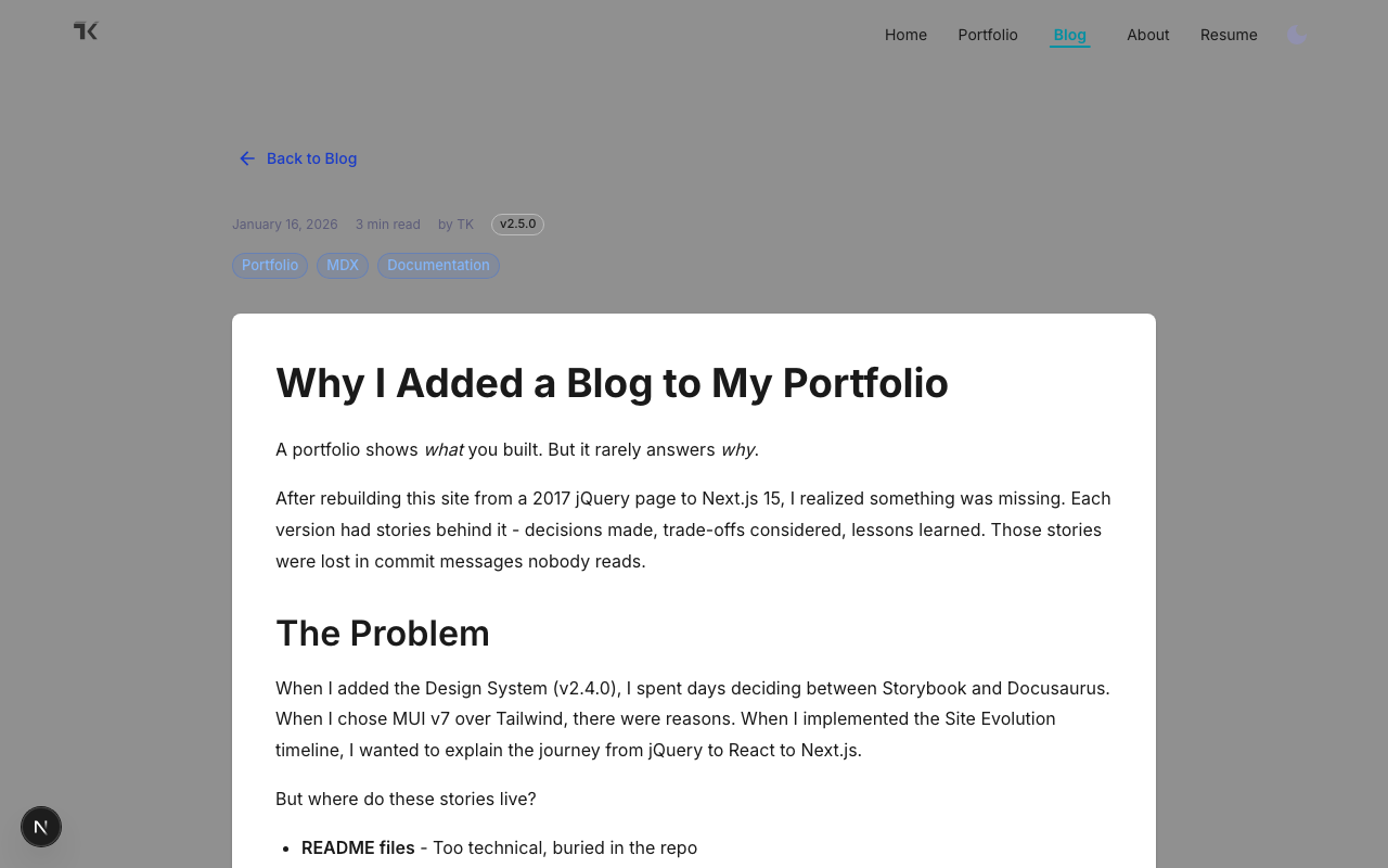 When I added the Design System (v2.4.0), I spent days deciding between Storybook and Docusaurus. When I chose MUI v7 over Tailwind, there were reasons. When I implemented the Site Evolution timeline, I wanted to explain the journey from jQuery to React to Next.js.