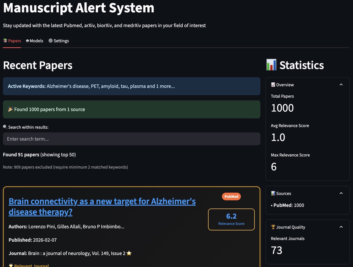 Research paper aggregator for Alzheimer's disease and neuroimaging researchers. Stay updated with the latest publications across multiple academic databases.